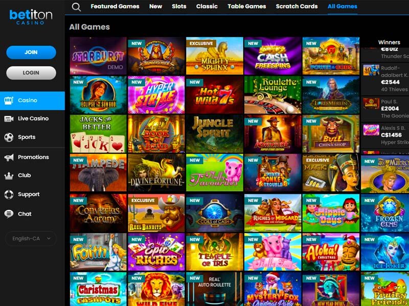 Dans la section Classique les joueurs pourront parier sur des machines à sous plus classique comme Funk Master de NetEnt par exemple. En cliquant sur la catégorie Jeux de casino, les joueurs du Canada pourront s'essayer aux jeux de tables gratuites ou non et même tenter de gagner gros au Baccara. Avec la section Grattage, le parieur a accès aux jeux de grattage gratuits tel que Slapshot, Hit the Bank, Power Cash. La catégorie Tous les jeux vous fait plutôt découvrir tous les jeux de casino gratuits ou payants proposés par Betiton Casino.