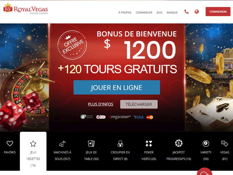 Royal Vegas Casino est un site de pari virtuel qui a une sélection impressionnante de jeux gratuits. Le casino a été fondé en 1998 et opère sur le marché avec une licence délivrée par la Malta Gaming Authority. Il est doté d'une interface conviviale affichant un ciel bleu parsemé d'étoile ainsi que des espaces de jeu et des hôtels luxueux. Par ailleurs, le site du Canada propose une large gamme de jeux de grandes compagnies de logiciel de l'eGaming. Ces options de divertissement incluent les machines à sous, les jeux de blackjack, de roulette, de baccarat, de vidéo poker, etc. En outre, pour booster le compte des joueurs du Canada, le site de jeux gratuits et d'argent réel offre des générosités allant des bonus aux tours gratuits. L'équipe de rédaction de jeuxgratuitscasino.ca a passé en revue les prestations du Casino. Continuez votre lecture pour en savoir plus !