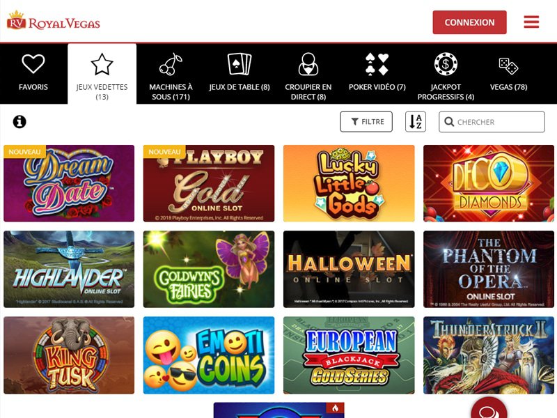 Royal Vegas Casino dispose d'une ludothèque de plus de 700 titres. Cet éventail de jeux gratuits et d'argent réel est le fruit de la collaboration du site avec des grands fournisseurs de logiciel tels qu'Evolution Gaming, Microgaming et NetEnt. La présence de ces leaders permet aux joueurs du Canada de vivre une expérience agréable et enrichissante non seulement sur les diverses variantes des machines à sous, des jeux de tables, mais aussi sur les titres avec de vrais croupiers en direct. En outre, les jeux gratuits et d'argent réel du site sont classés par catégorie.