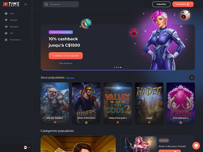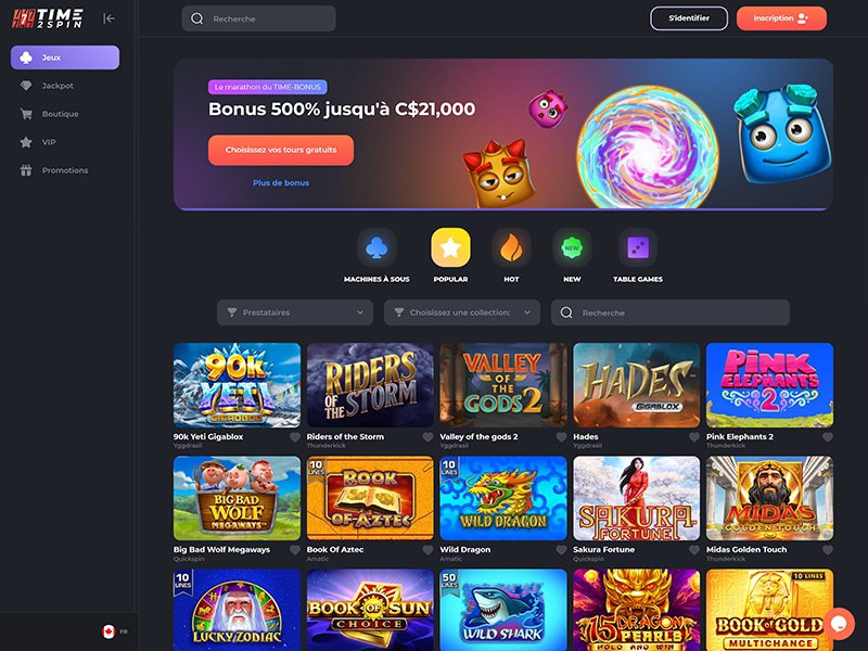 Si vous recherchez un casino en ligne au Canada sur lequel jouer aux jeux gratuits, machines à sous et jeux de table, Time2Spin Casino est fait pour vous. Cette plateforme propose +3000 jeux parmi lesquels on retrouve des slots, des jeux de roulette, de blackjack et bien plus encore. Ces différents titres sont des productions de célèbres fournisseurs de jeux de casino gratuits comme Evolution Gaming, Play'n Go, Yggdrasil, EvoPlay. Afin de vous permettre de profiter de ses meilleurs jeux gratuits, le site vous offre de généreux bonus. Poursuivez votre lecture pour en d'avantage sur ce casino.